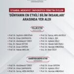 Stanford Üniversitesi öncülüğündeki araştırma ekibi tarafından dünyadaki bilim insanları arasında ilk yüzde 2’lik dilime giren 200 bini aşkın bilim insanının, yayınlarına yapılan atıfların etkisine göre sıralandığı “Dünyanın En Etkili Bilim İnsanları” listesinin Eylül 2025 sürümü Elsevier veri tabanında yayımlandı. “Kariyer Boyu Etki” ve “Yıllık Etki (2024 Yılı Çalışmaları)” olarak iki kategoride yayımlanan listede üniversitemizden “Yıllık Etki” kategorisinde 13 akademisyen, “Kariyer Boyu Etki” kategorisinde 6 akademisyen yer aldı.