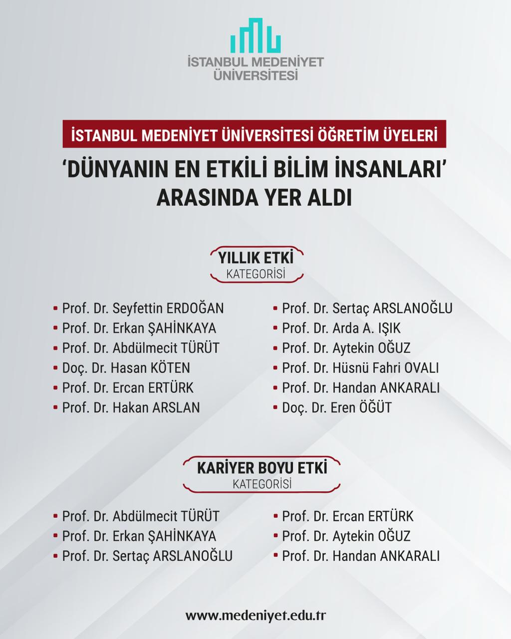 Stanford Üniversitesi öncülüğündeki araştırma ekibi tarafından dünyadaki bilim insanları arasında ilk yüzde 2’lik dilime giren 200 bini aşkın bilim insanının, yayınlarına yapılan atıfların etkisine göre sıralandığı “Dünyanın En Etkili Bilim İnsanları” listesinin Eylül 2025 sürümü Elsevier veri tabanında yayımlandı. “Kariyer Boyu Etki” ve “Yıllık Etki (2024 Yılı Çalışmaları)” olarak iki kategoride yayımlanan listede üniversitemizden “Yıllık Etki” kategorisinde 13 akademisyen, “Kariyer Boyu Etki” kategorisinde 6 akademisyen yer aldı.