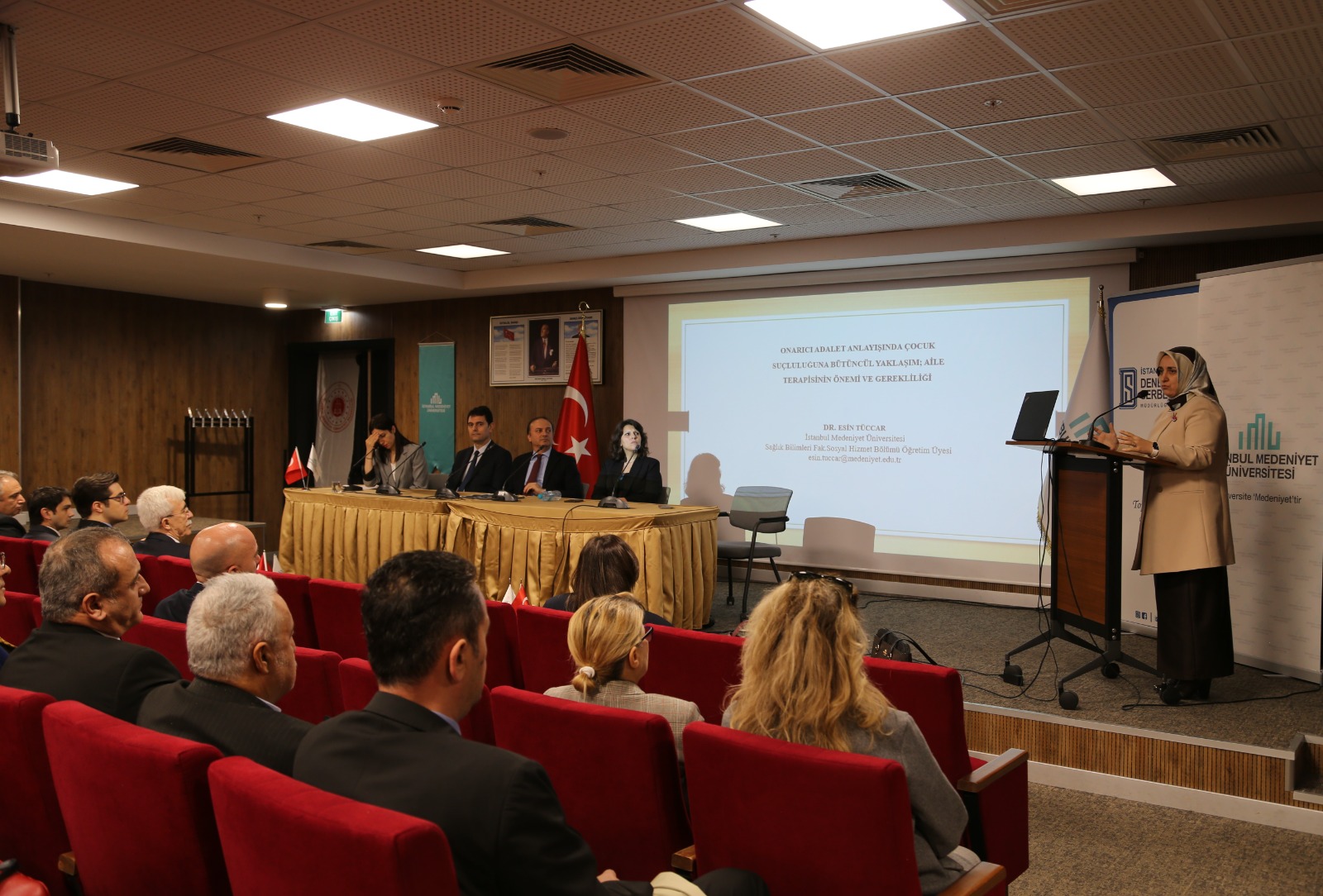 Oturum bölümü ile devam eden panel, Rektör Yardımcımız Prof. Dr. Fatih Sarıoğlu’nun moderatörlüğünde gerçekleştirildi. “Kazanımlar, Zorluklar ve Gelecek” başlığıyla düzenlenen oturumda rehabilitasyon, istihdam ve kurumsal iş birliği konularına odaklanıldı. Sosyal Hizmet Bölümü akademisyenlerimizden Dr. Öğr. Üyesi Esin Tüccar, çocuk suçluluğu ve rehabilitasyonunda aile sistem terapisinin önemini vurgularken, günümüzdeki sosyal medyanın yarattığı “beyin çürümesi” metaforu ve empati yoksunluğu gibi yeni zorluklara karşı “Onarıcı Adalet” yaklaşımı içinde destekleyici ve iyileştirici çalışmalara ihtiyaç olduğunu belirtti. İstanbul Anadolu Denetimli Serbestlik Uzmanı Şeyda Arda, bireysel görüşmelerde travma odaklı bir yaklaşım olan EMDR (Göz Hareketleriyle Duyarsızlaştırma ve Yeniden İşleme) tekniğinin, hükümlülerin suça bağlı travmatik anılarını işleyerek suça eğilimi azaltmadaki potansiyelini anlattı.