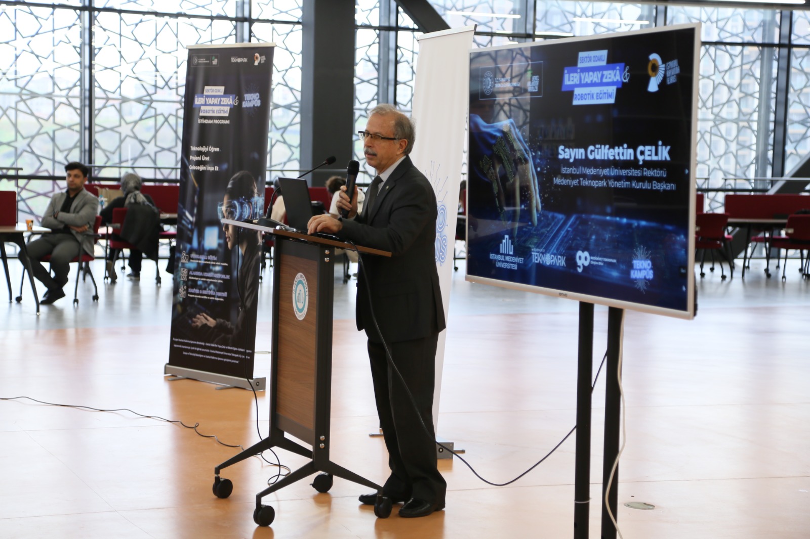 27 Mart Cuma günü İstanbul Medeniyet Üniversitesi Ziraat Bankası Kütüphanesi Fuaye Alanında düzenlenen programın açılışı, Rektörümüz Prof. Dr. Gülfettin Çelik ve İMÜ Teknopark Genel Müdürü ve Genel Sekreterimiz Ali Ramazan Tak’ın konuşmalarıyla gerçekleştirildi. Genel Sekreterimiz Ali Ramazan Tak, bu projenin fikri teknolojiye, teknolojiyi ise girişime dönüştüren güçlü bir yapıya sahip olduğunu vurgulayarak, üniversitenin yapay zeka laboratuvarındaki temel vizyonunun teknolojiyi sadece tüketen değil, bizzat üreten nesiller yetiştirmek olduğunun altını çizdi. Rektörümüz Prof. Dr. Gülfettin Çelik ise bu tür ekosistemleri üniversite eğitiminin ayrılmaz bir parçası olarak gördüğünü belirtti. Çelik, şirketlerin, öğrencilerin ve akademisyenlerin oluşturduğu bu sinerjinin ve birlikteliğin İstanbul Medeniyet Üniversitesi’ni çok daha ileri bir noktaya taşıyacağını ifade etti.