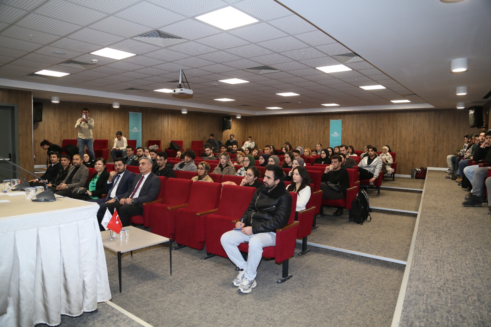 Üniversitemiz bünyesinde faaliyet gösteren 107 öğrenci kulübünün akademik standartlara uygunluğunu değerlendirmek, kulüp faaliyetlerinin kapsayıcılığını artırmak ve öğrenci toplulukları ile üniversite yönetimi arasındaki koordinasyonu güçlendirmek amacıyla Sağlık, Kültür, Spor Dairesi Başkanlığı tarafından düzenlenen “Kulüp Başkanları Toplantısı” 8 Ocak 2026 Perşembe günü Merkez Kütüphane Ziraat Bankası Konferans Salonu’nda gerçekleştirildi.
