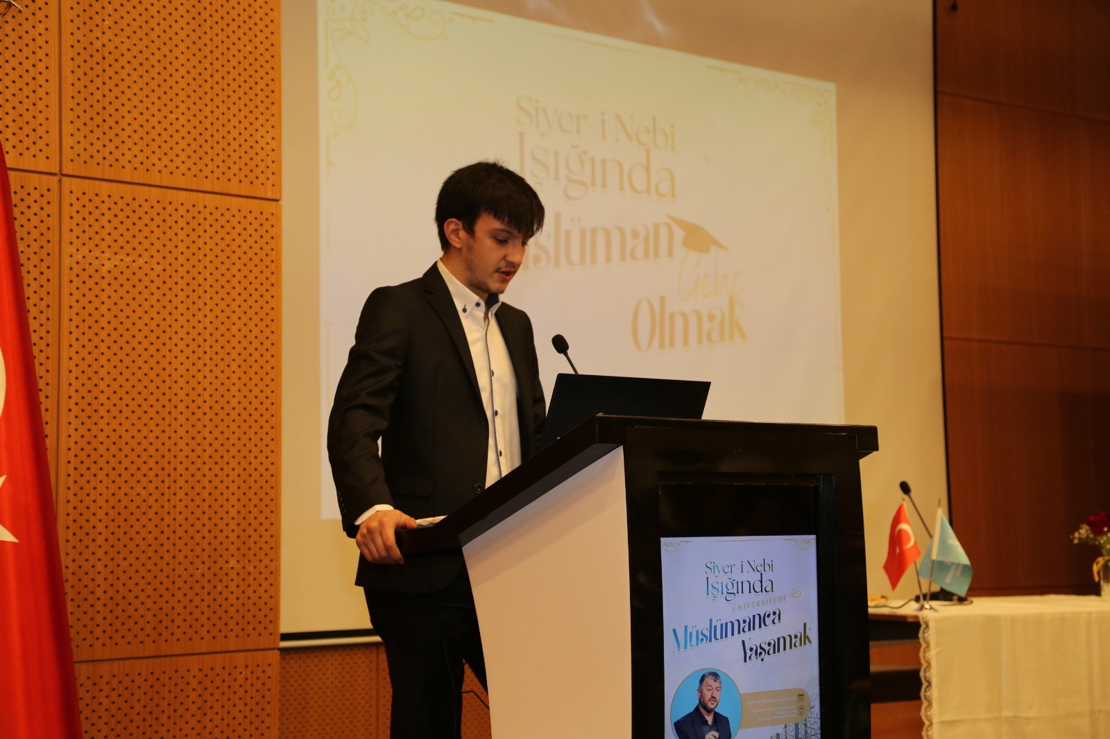 Açılış bölümünün ardından program, Siyer Vakfı Kurucusu Muhammed Emin Yıldırım’ın sunumuyla devam etti. Yıldırım konuşmasında; siyer ilminin metodolojik önemi, Siyer-i Nebi okumalarının gençliğin fikrî ve ahlaki gelişimi üzerindeki etkisi ve temel insani sorumluluklar konularına değindi. Müslüman bir gencin kimlik inşasında siyerin rehberlik edici niteliğini vurgulayan Yıldırım, konuyu inanç ve sorumluluk bilinci çerçevesinde analiz etti.