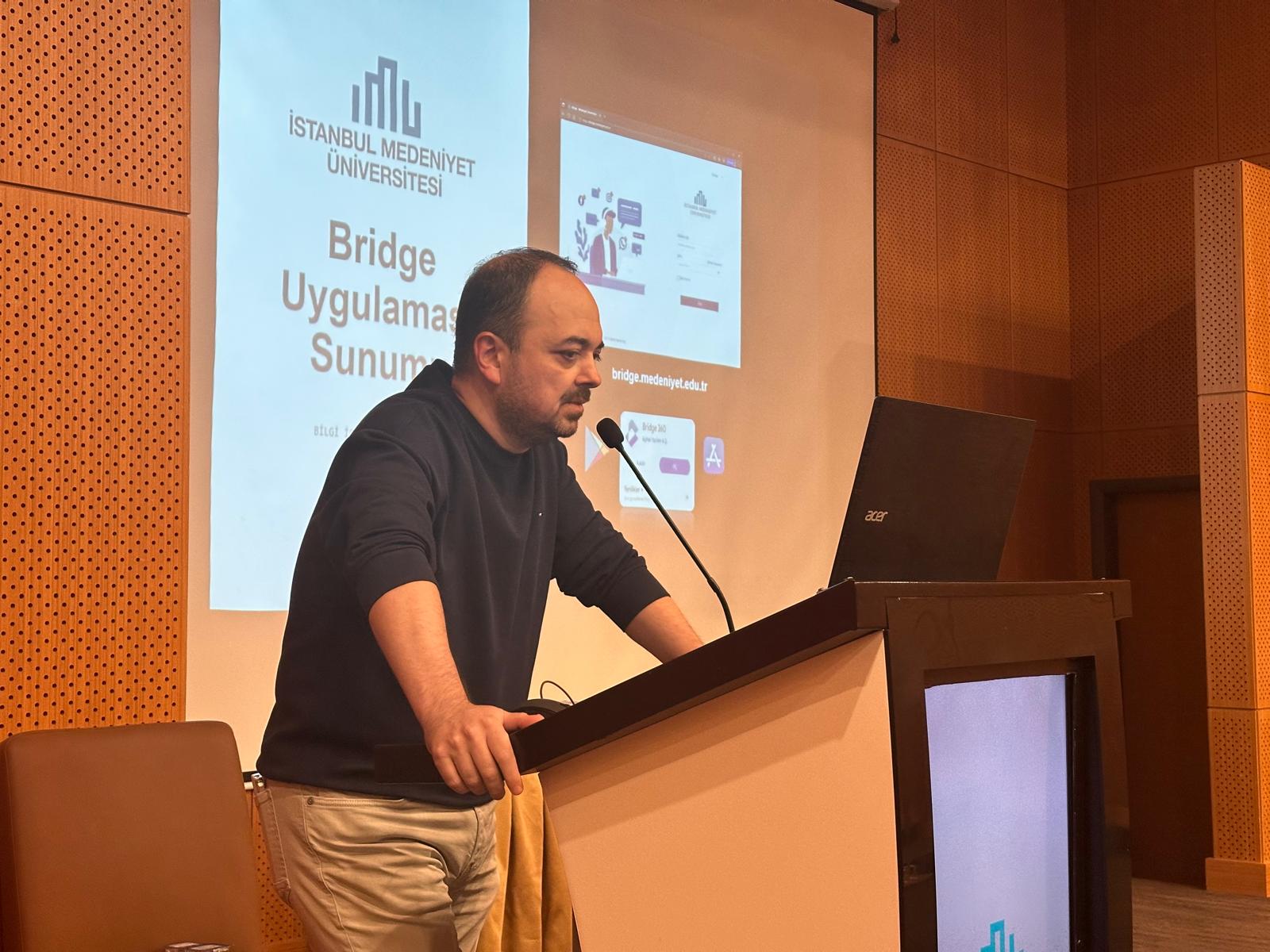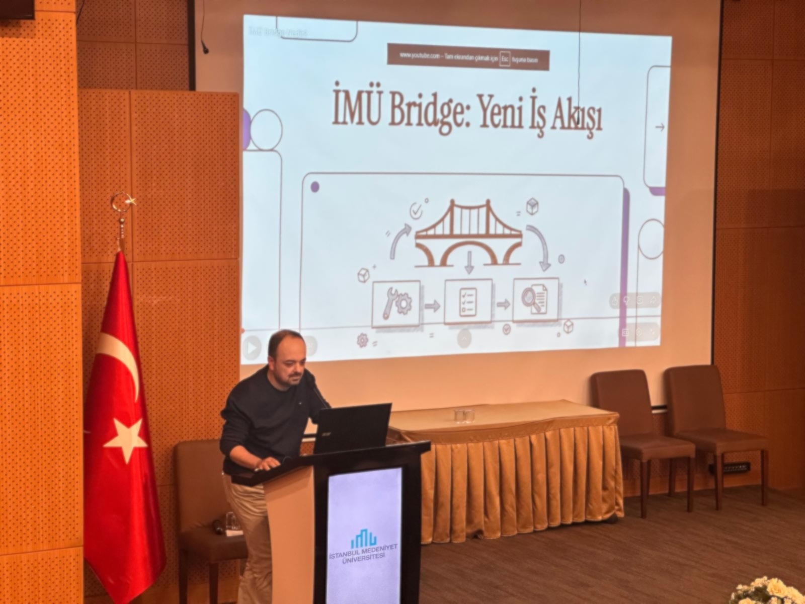 “Bridge / Yardım Masası” başlıklı sunumuna İMÜ Bridge uygulamasına erişim yolları hakkında bilgi vererek başlayan Raşit Kılınçaslan, devamında katılımcılara uygulamayı detaylı bir şekilde tanıtan bir video izletti. Videoda, Üniversitemizdeki bütün işlerin dijital olarak şeffaf bir şekilde takip edildiği ve yönetildiği merkezi sistem olan İMÜ Bridge uygulamasının iş akışlarını nasıl kolaylaştırdığı ve sistemde görev yönetiminin adım adım nasıl gerçekleştirildiği hakkında bilgiler verildi. Sistemin modülleri tanıtıldıktan sonra ilk modül olan görev yönetim sisteminin detaylı kullanımı ve sisteme erişimin nasıl sağlandığı anlatıldı. Videonun ardından Raşit Kılınçaslan katılımcılara, sistemdeki modüllerin kullanımını adım adım uygulamalı olarak anlattı.