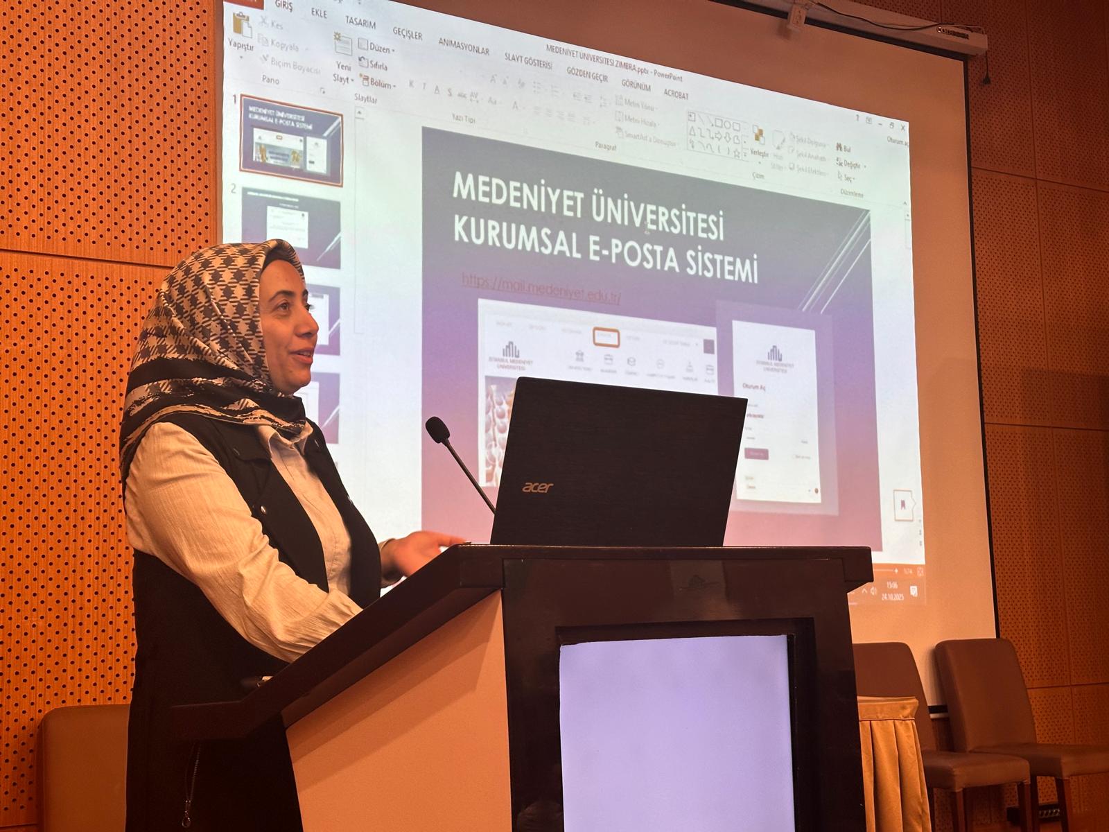 Eğitimin ikinci bölümünde Bilgi İşlem Daire Başkanlığı’ndan Arife Bayraktar, Üniversitemizde yakın dönemde kullanılmaya başlanan kurumsal e-posta yazılımı Zimbra’yı tanıtan bir sunum gerçekleştirdi. “Etkili Zimbra Kullanımı” başlıklı sunumunda açık kaynak kodlu bu yazılımın kullanımının güvenlik ve çeşitli alanlarda sağladığı avantajlar hakkında bilgi veren Arife Bayraktar, yazılımın masaüstü bilgisayarlar ve mobil cihazlara kurulumu ve gerekli ayarların nasıl yapılacağı hakkındaki bilgileri uygulamalı olarak aktardı.
