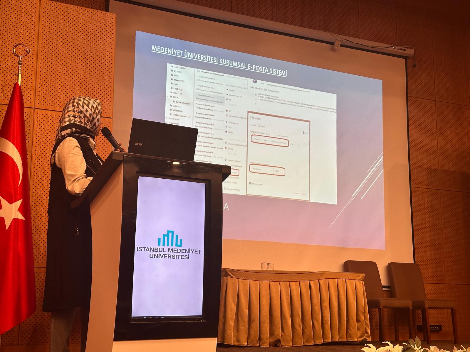 Üniversitemizde görev ve iş akışlarının yönetim, takip ve raporlanmasında kullanılan bilgi işlem uygulamaları konusunda idari personelimizi bilgilendirmek amacıyla düzenlenen “Bridge / Yardım Masası ve Etkili Zimbra Kullanımı” başlıklı hizmet içi eğitim programı, 24 Ekim 2025 Cuma günü Güney Yerleşke Aşık Paşa Konferans Salonu’nda gerçekleştirildi. Genel Sekreter Yardımcılarımız Yıldırım Tilaver ve Mehmet Kemal Çakır ile idari personelimizin katıldığı eğitim programında, Bilgi İşlem Daire Başkanlığı personeli Raşit Kılınçaslan ve Arife Bayraktar tarafından İMÜ Bridge ve Zimbra sistemleri hakkında sunumlar gerçekleştirildi.