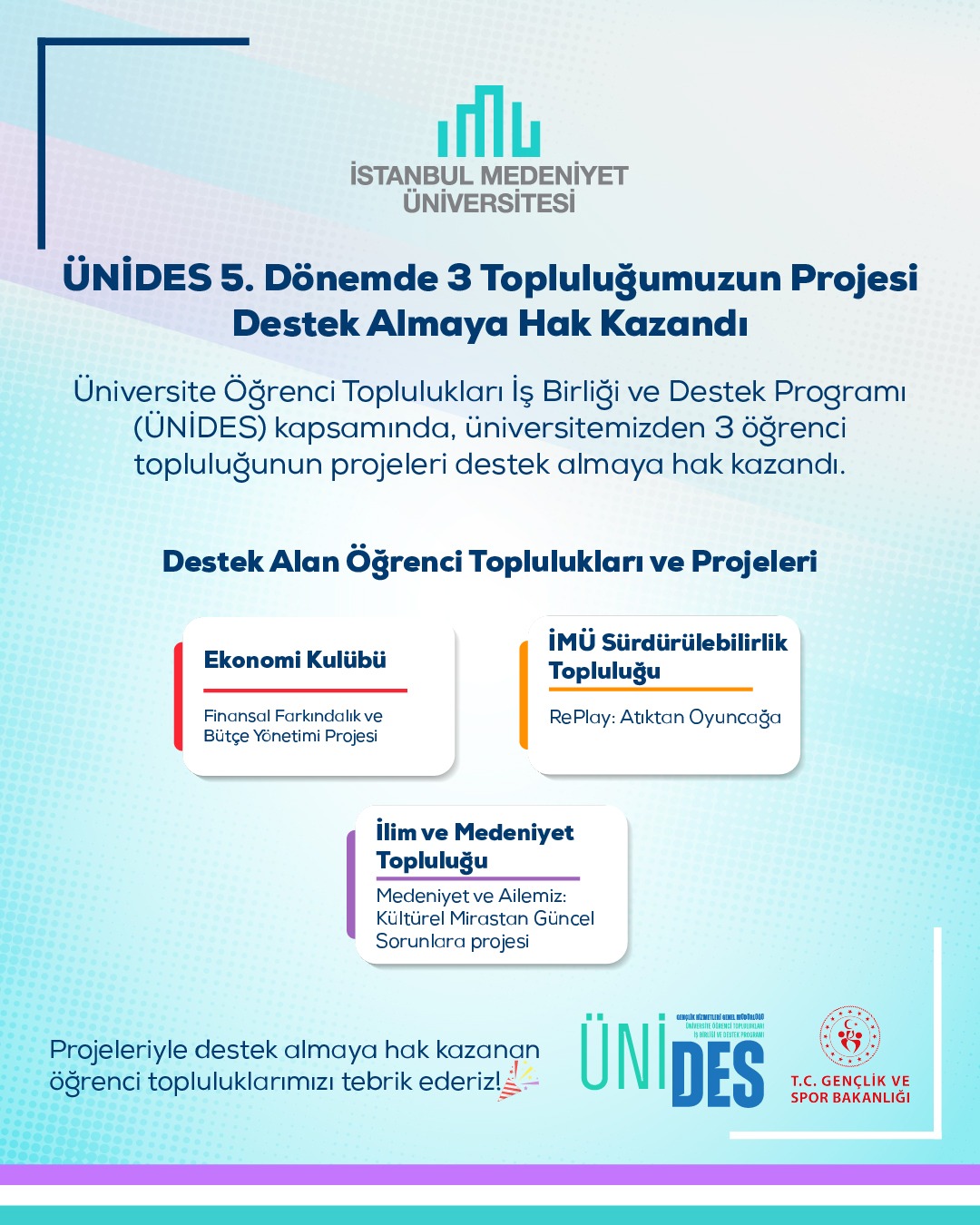 Gençlik ve Spor Bakanlığı Gençlik Hizmetleri Genel Müdürlüğü tarafından yürütülen Üniversite Öğrenci Toplulukları İş Birliği ve Destek Programı (ÜNİDES)’in 5. Dönem başvuru sonuçları açıklandı. Üniversitemizin Sürdürülebilirlik Topluluğu, Ekonomi Topluluğu ile İlim ve Medeniyet Topluluğu, hazırladıkları projelerle destek almaya hak kazandı.